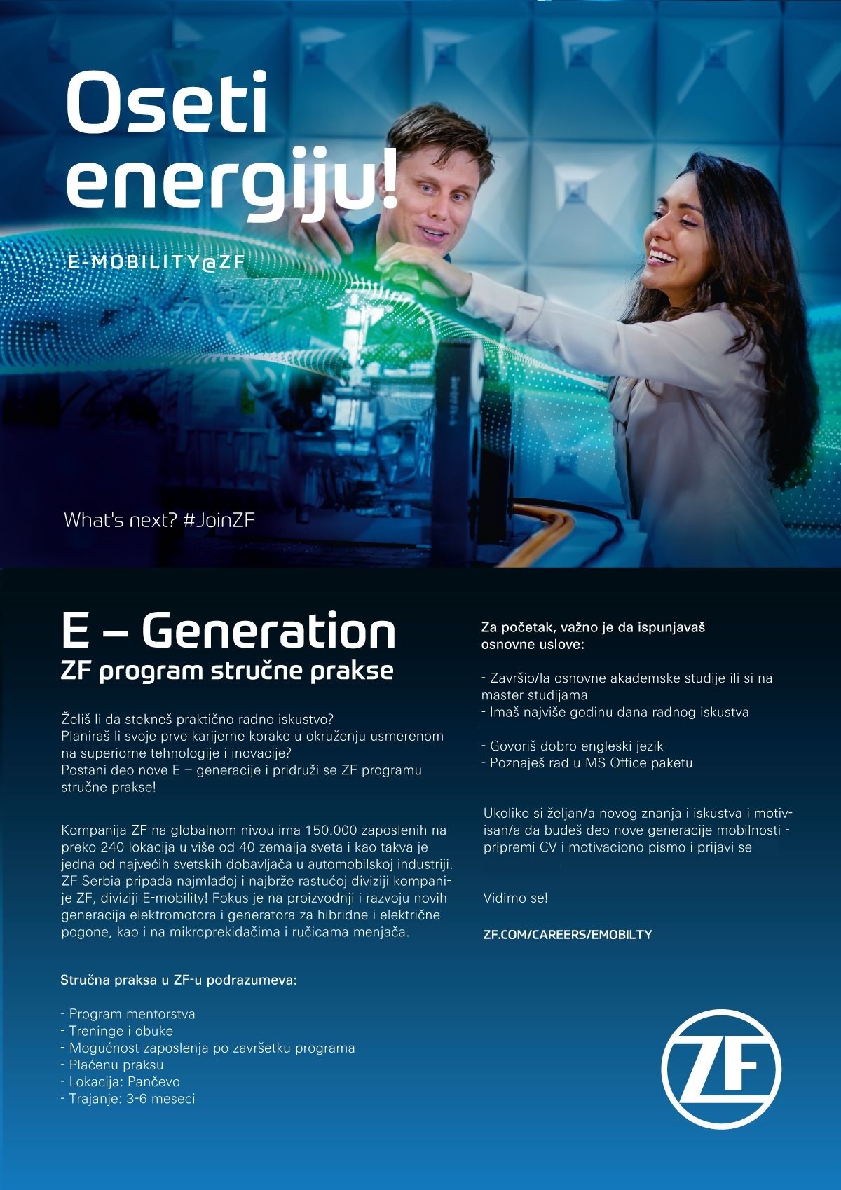 Tehnološka kompanija ZF Group koja u Srbiji ima proizvodni pogon i inženjerski centar u Pančevu u kojima zapošljava preko 1100 radinika različitih profila...