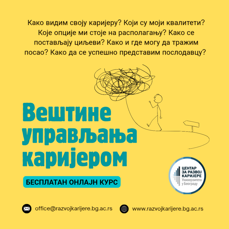 Позивају се студенти завршних година студија на Универзитету у Београду да се пријаве за похађање курса „Вештине управљања каријером“ Центра за развој каријере и саветовање студената.